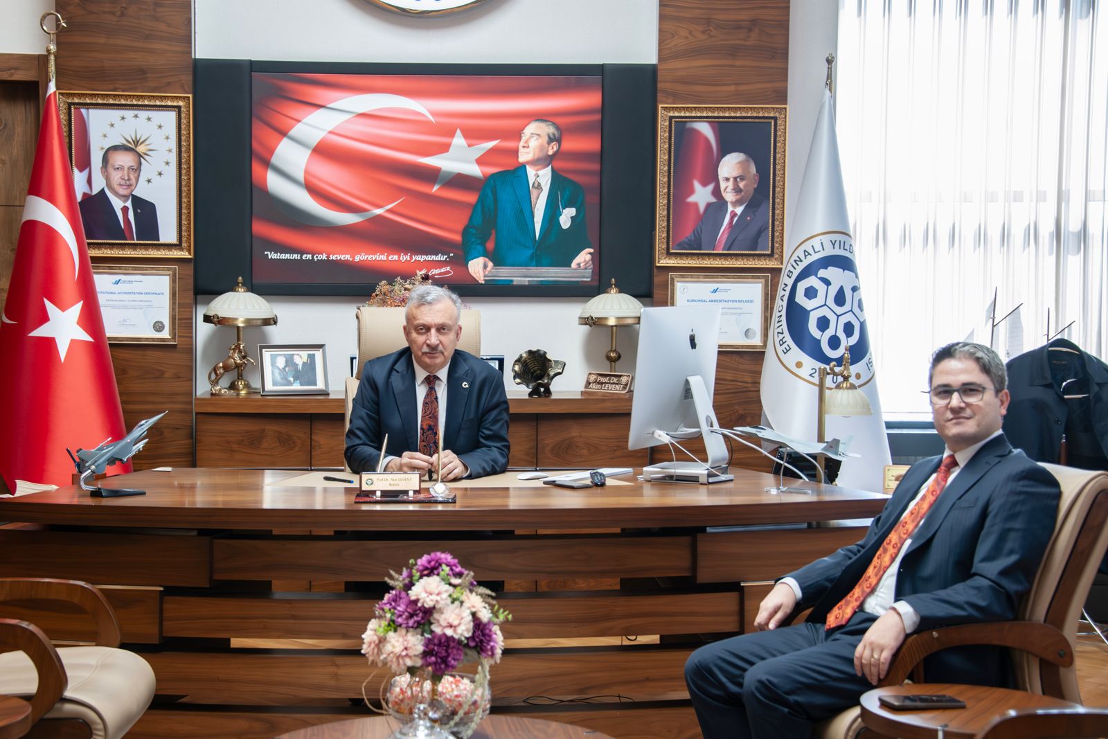 Erzincan Binali Yıldırım Üniversitesi Rektörü Prof. Dr. Akın Levent, görevine yeni başlayan 59. Havan ve Topçu Eğitim Tugay Komutanı Tuğgeneral Zafer Akkaş’a hayırlı olsun ziyaretinde bulundu. Komutanlık makamında gerçekleştirilen ziyarette