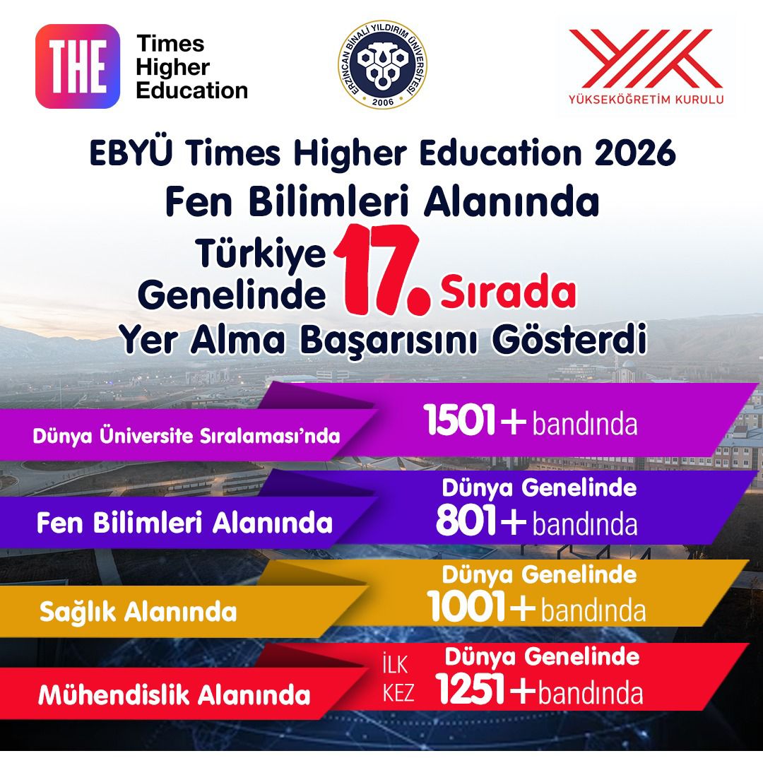 Dünyanın saygın yükseköğretim derecelendirme kuruluşlarından biri olan Times Higher Education (THE) tarafından açıklanan 2026 Yılı Dünya Üniversite Sıralaması (World University Rankings) sonuçlarında, Erzincan Binali Yıldırım Üniversitesi uluslararası ölçekte değerlendirilen üniversiteler arasında 1501+ bandında yer aldı.