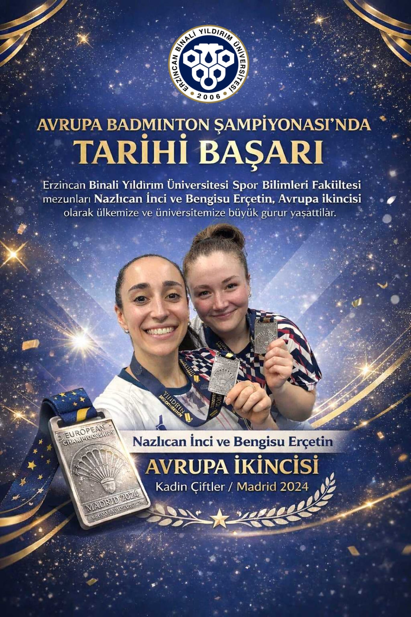 İspanya’da düzenlenen Avrupa Badminton Şampiyonası’nda Erzincan Binali Yıldırım Üniversitesi Spor Bilimleri Fakültesi mezunları Nazlıcan İnci ve Bengisu Erçetin, elde ettikleri tarihi başarıyla ülkemize büyük bir gurur yaşattı.
