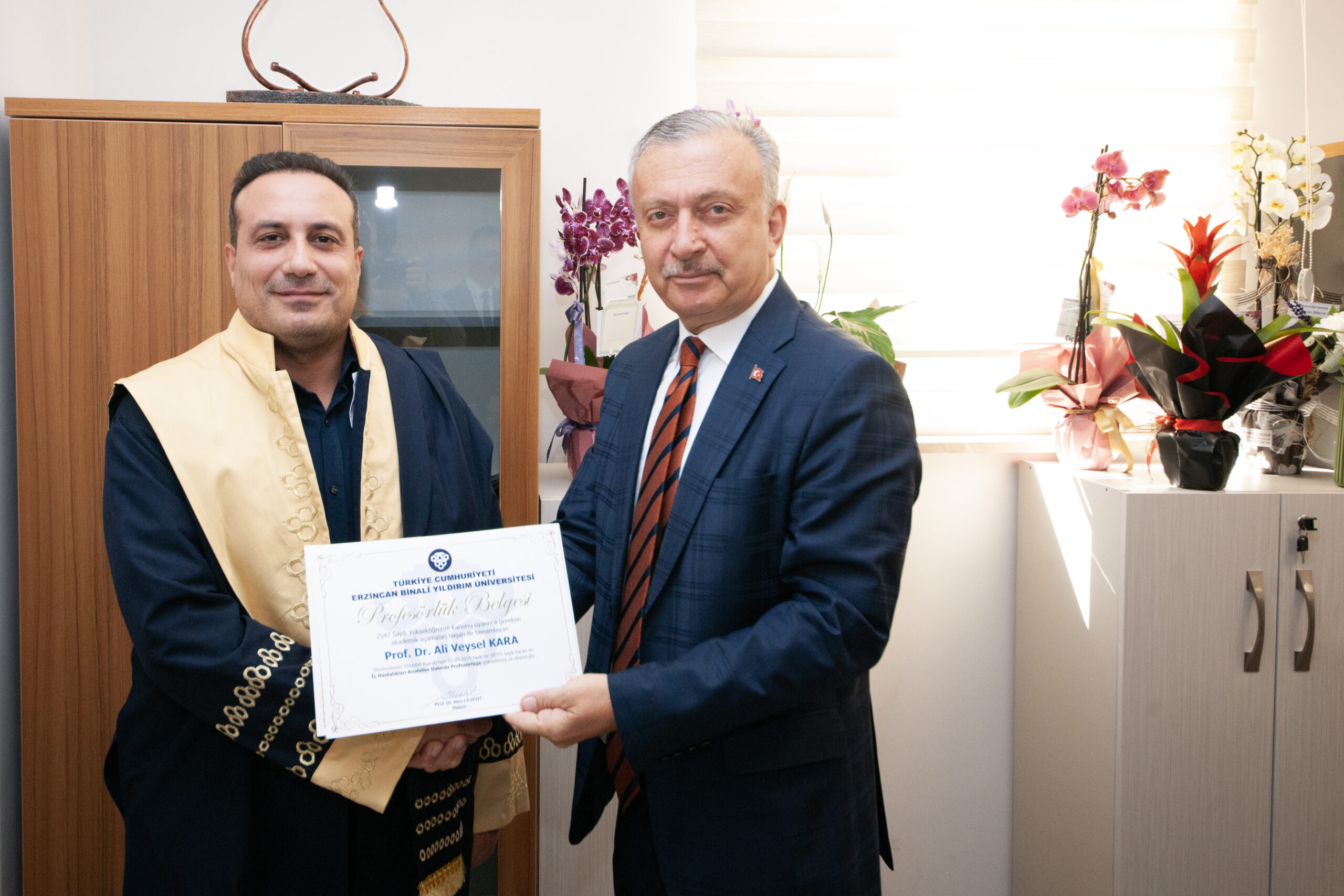 Erzincan Binali Yıldırım Üniversitesi Rektörü Prof. Dr. Akın Levent, üniversitemiz Tıp Fakültesinde profesör ünvanı almaya hak kazanan Dahili Tıp Bilimleri Bölümü, İç Hastalıkları Anabilim Dalı Öğretim Üyesi Prof. Dr. Ali Veysel Kara, Cerrahi Tıp Bilimleri Bölümü, Üroloji Anabilim Dalı Öğretim Üyesi Prof. Dr. Selahattin Çalışkan,  Temel Tıp Bilimleri Bölümü, Tıbbi Mikrobiyoloji Anabilim Dalı Öğretim Üyesi Prof. Dr. Merve Aydın Terzioğlu’na hayırlı olsun ziyaretinde bulundu. Ziyarete Rektör Yardımcısı Prof. Dr. Çağrı Çırak eşlik etti.