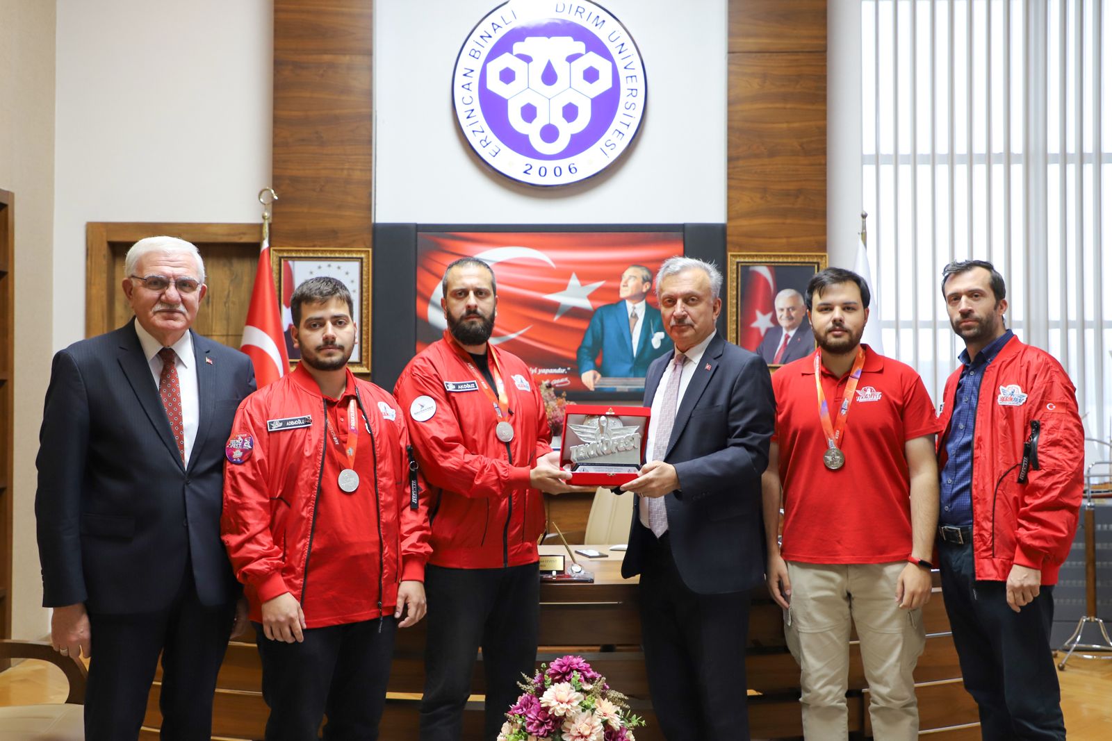 TEKNOFEST 2025 Robolig Yarışması (Üniversite ve Üzeri Seviye) kategorisinde Türkiye ikinciliği elde eden Erzincan Binali Yıldırım Üniversitesi öğrencilerimiz, danışman akademisyenleri Öğr. Gör. Nurettin Oğuzhan Akoğuz ile birlikte Rektörümüz Prof. Dr. Akın Levent’i makamında ziyaret etti.